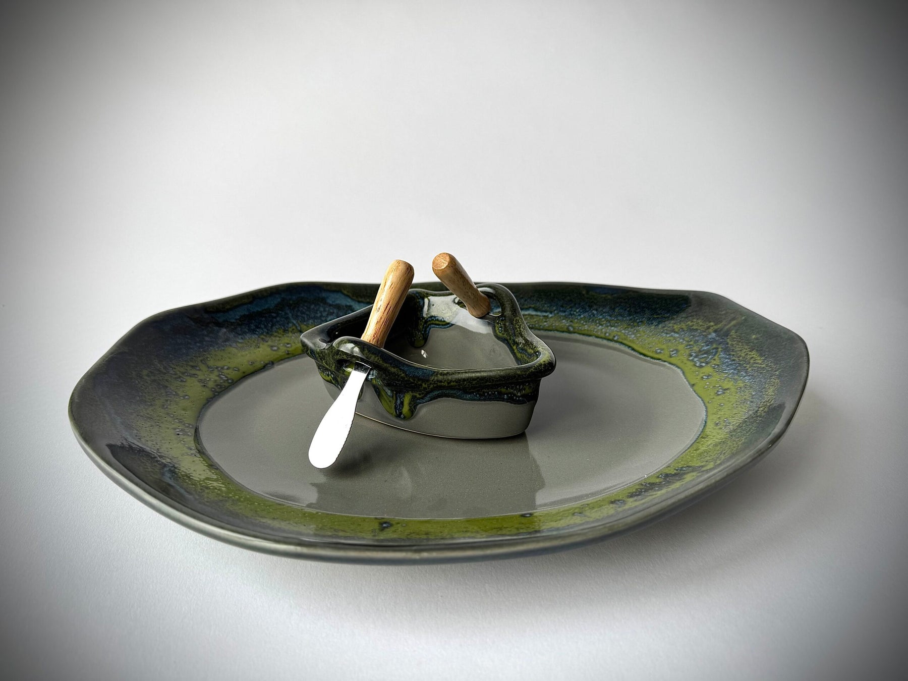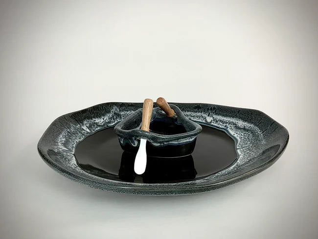 This piece is great for dips and chips, veggies and breads or for salsa and nachos. Dimensions: pond approximately 14" long x 10" wide boat approximately 5" long x 3.5" wide Comes with two oars (spreaders) and description card.